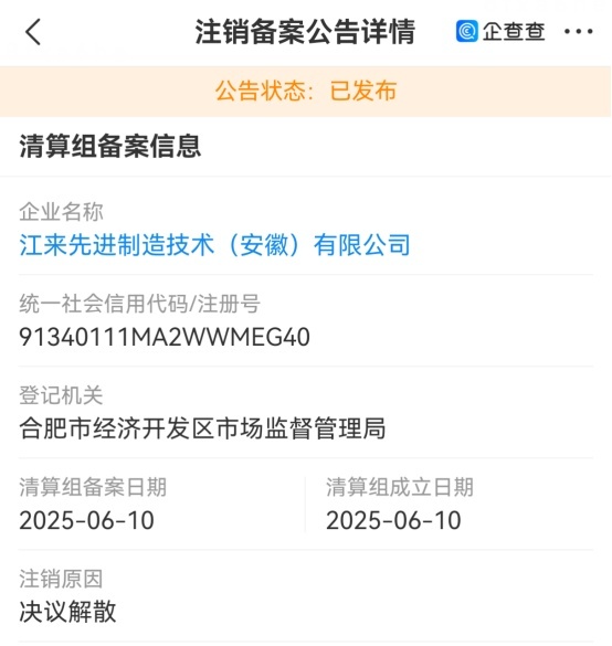 笼罩蔚来的迷雾,还未消散,一场更大的争议,突然在网络炸开:2021年,由蔚来控股有限公司、安徽江淮汽车集团股份有限公司共同持股成立的江来先进制造技术(安徽)有限公司,于近日新增1条注销备案公告,注销原因为决议解散。