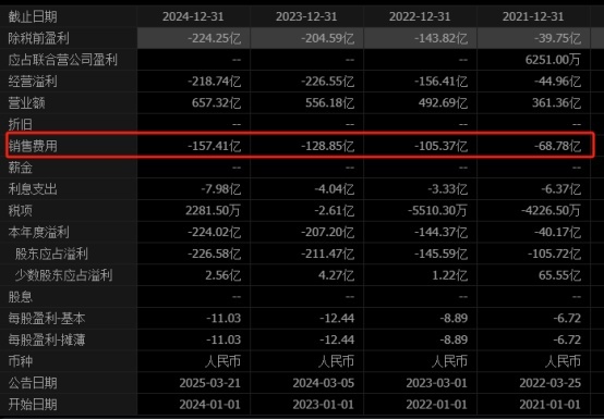 回顾其2021年—2024年的财报数据,4年间,其销售费用从68.78亿增长到157.41亿,销售费用在整体营收中的占比从19.03%提高至23.95%。